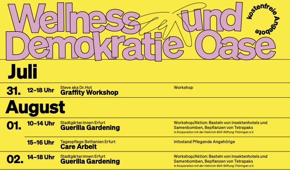 "Seit 30. Juli bis zum 18. August steht mitten auf dem Platz der Völkerfreundschaft in Erfurt ein alter Schiffscontainer, der zu einem Begegnungsort werden soll. Eine „Wellness- und Demokratieoase“ im Erfurter Rieth. Es handelt sich dabei um ein Projekt der PHOENIX Theaterfestivals, das zudem von 15. bis 18. August erstmals die Plattenstufen-Festspiele an diesem Ort initiiert. Mit einem Tagungsprogramm, Gastspielen, einer Lesung und einem vielfältigen Rahmenprogramm soll der Platz in ein kulturelles Zentrum verwandelt werden.